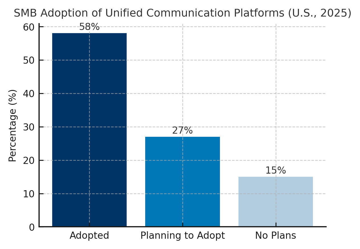 The shift toward hybrid work and cloud-based systems has made reliable, secure communication essential. According to Statista (2025), more than 60% of U.S. SMBs have adopted or plan to adopt unified communication platforms, recognizing them as key to improving responsiveness and collaboration. As digital maturity grows, the ability to integrate AI, mobile collaboration, and security into daily workflows will define competitive advantage.