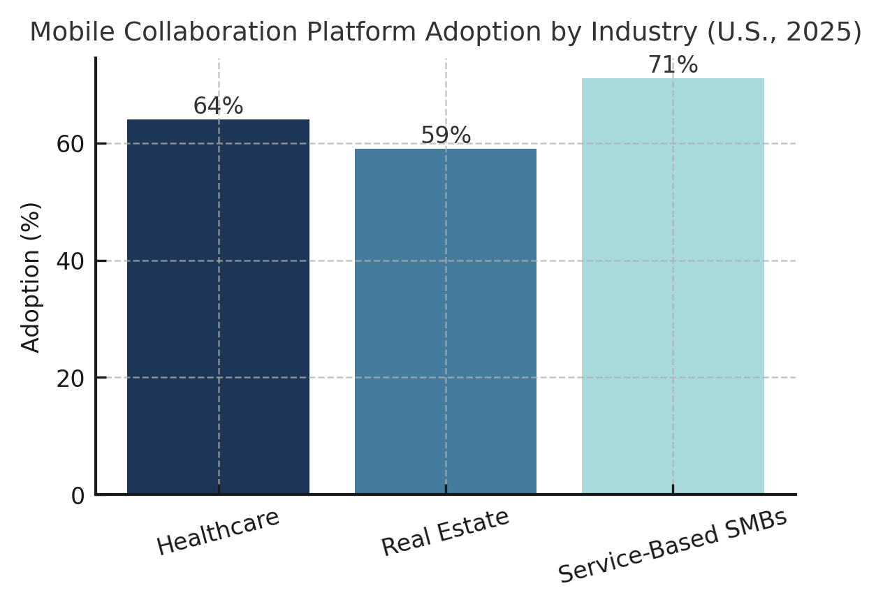 As remote work continues, mobile collaboration has become non-negotiable. Employees and clients expect access to communication platforms from any device, anywhere. Statista (2025) reports that 64% of healthcare SMBs and 71% of service-based SMBs have adopted mobile collaboration tools to stay connected.
